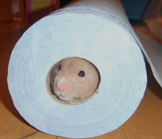 ▽ロール状になっているキッチンペーパーの中でくつろいでいるハムスター。