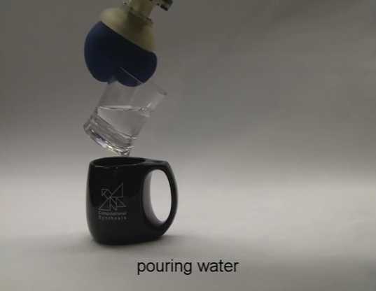 つかみロボットは、ペンやショックアブソーバー等をつかむだけでなく、水の入ったコップを持って注ぐことも、ペンを持って書くことも適切にこなしている。