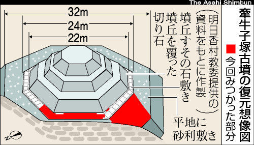 墳丘の周囲に敷かれた切り石の並んだ形状から、八角形墳とわかった牽牛子塚古墳